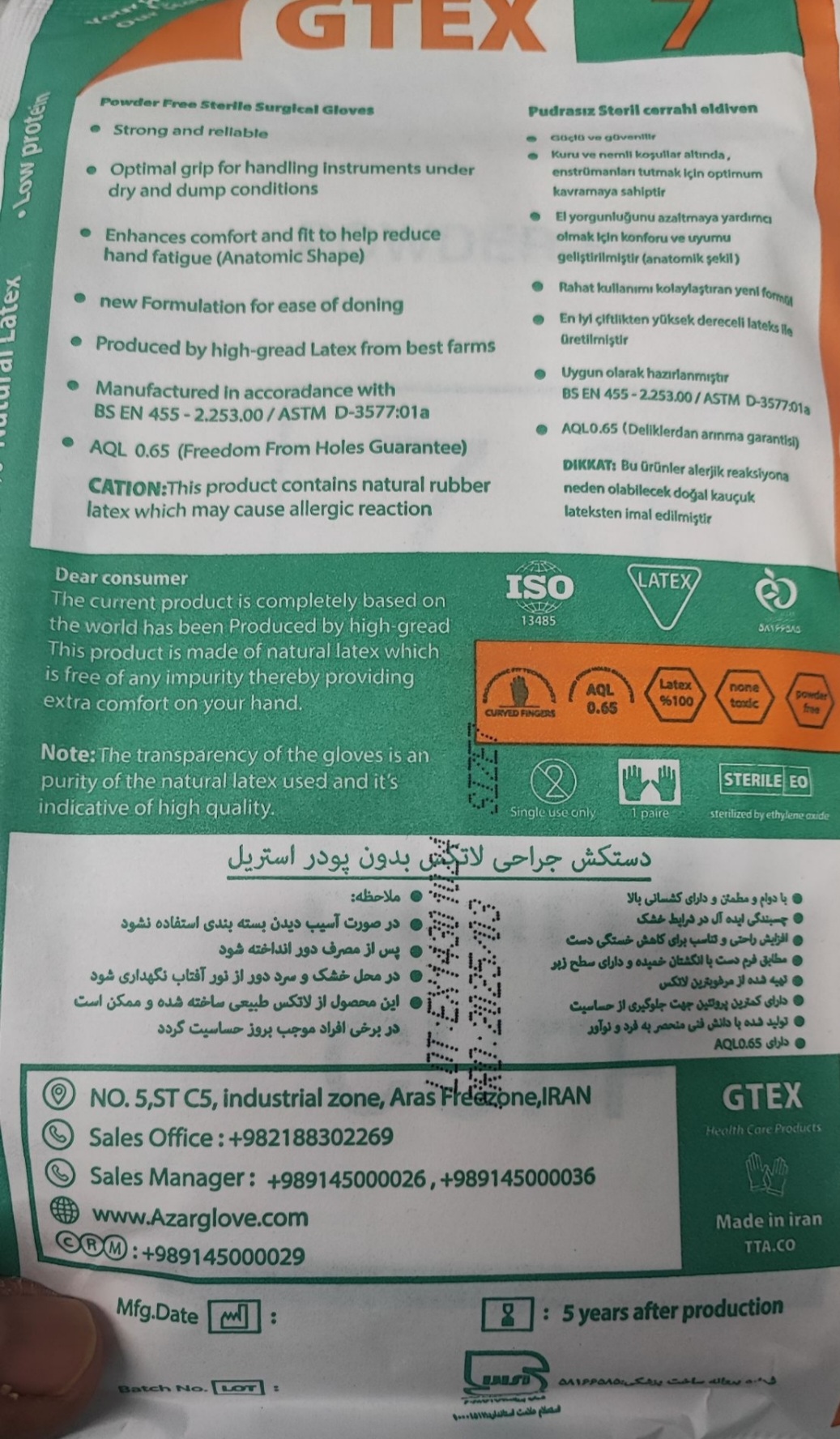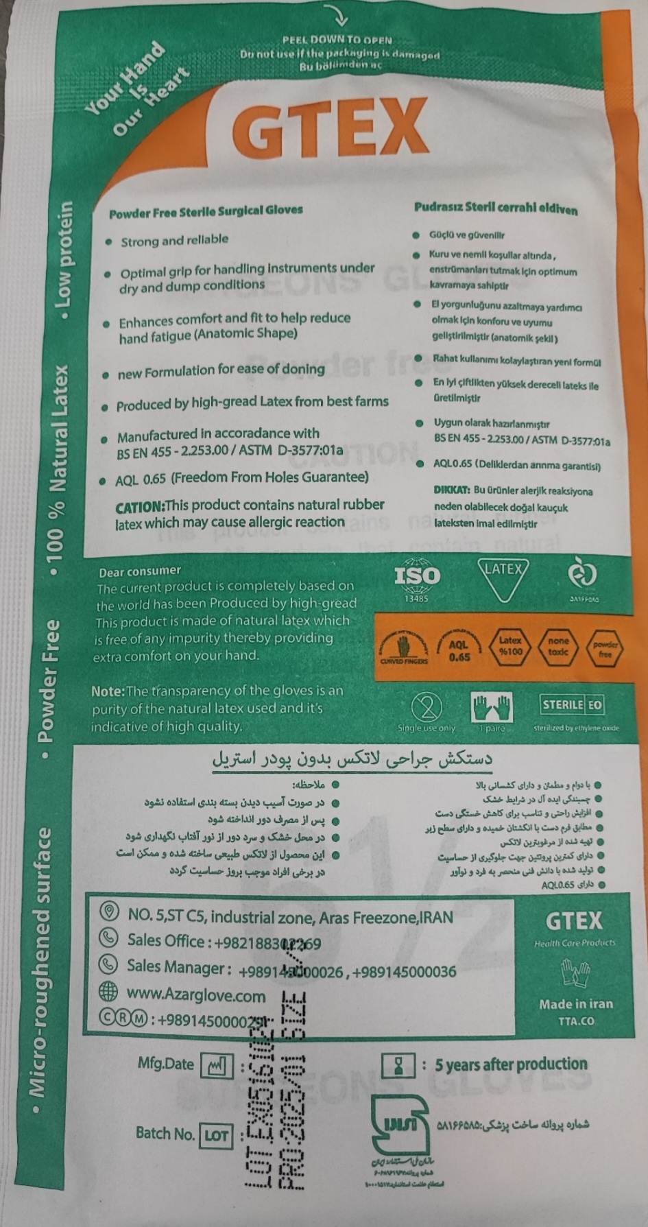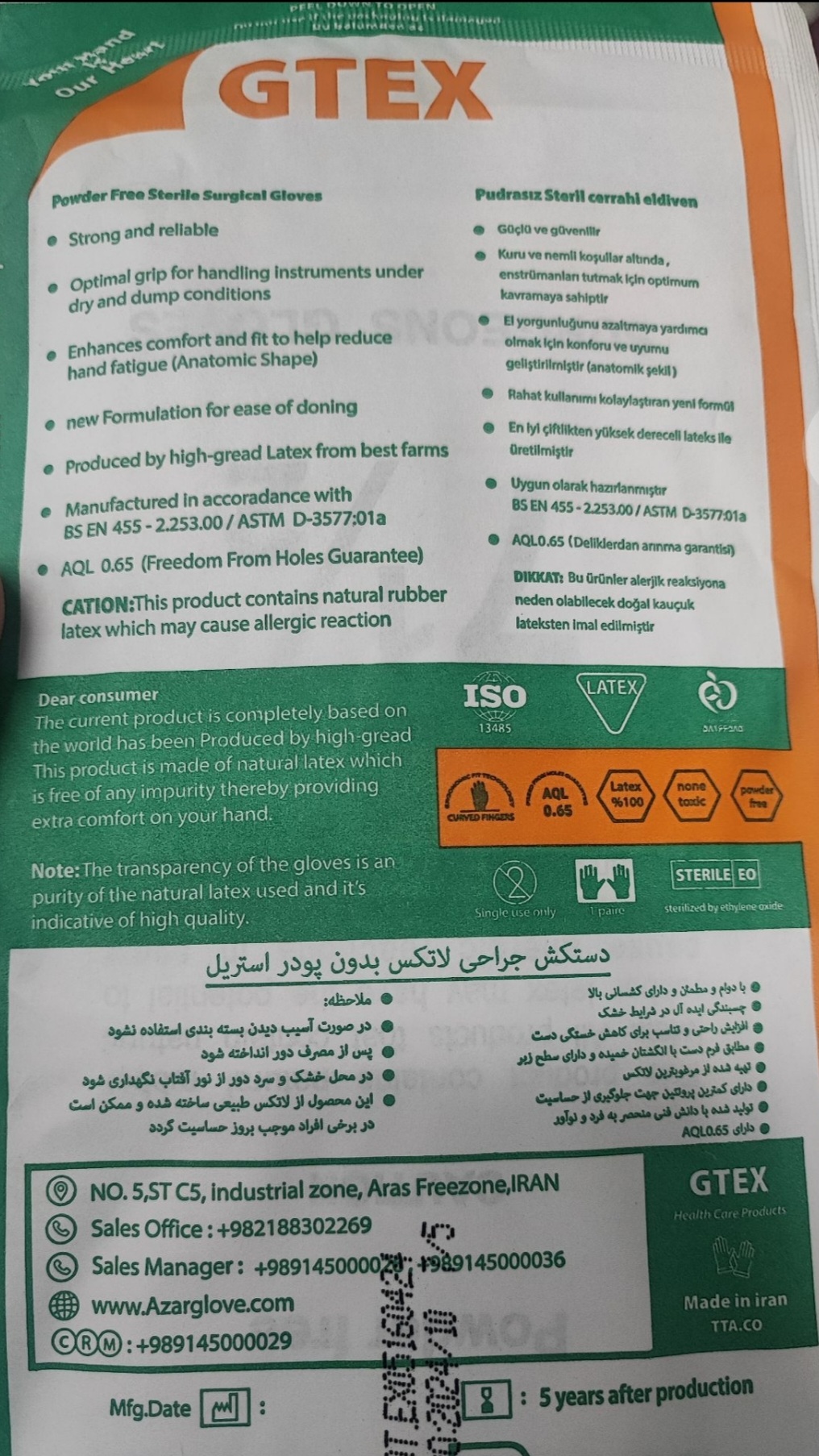 شاخصه های دستکش جراحی لاتکس استریل جیتکس : تهیه شده از لاتکس خالص طبیعی( Double Centrifuged) انعطاف پذيري، كشساني و راحتي مناسب در هنگام استفاده استریل شده توسط گاز اتیلن اکساید EO و اشعه گاما دارا بودن ویژگی پوشش راحت Easy Donning امکان پوشيدن دستکش به صورت دو لايه داراي مقاومت عالي نسبت به پاره شدن در سایزهای ۶/۵ ، ۷ ، ۷/۵ ، ۸ ، ۸/۵ گرفتن و كنترل ابزار به بهترين نحو عدم بازتاب نور هنگام عمل جراحی مورد استفاده در عمل های جراحی حفظ حس لامسه مناسب